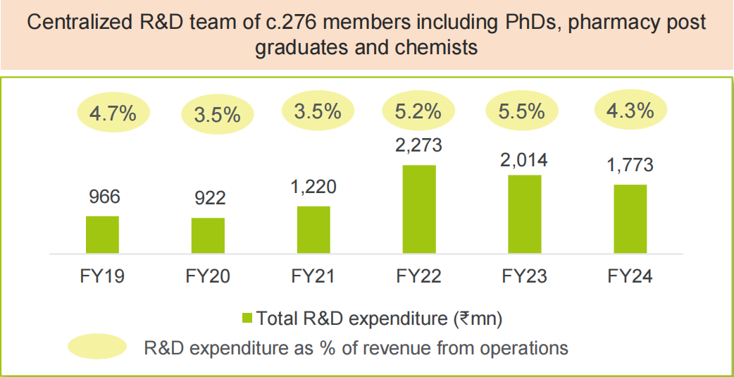 2024财年Gland Pharma超过89种产品在核心市场推出,总研发支出17.74亿卢比(0.21亿美元),占基础业务收入的4.3%,递交了19项ANDA申请,24个ANDA申请获批,2个药物主文件(DMF)获批。截至2024年3月,Gland及其合作伙伴在美国共提交了349项ANDA申请,其中286项已获批准,63项正在等待批准。