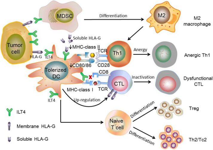 2、ILT4与HLA-G连接损害DC成熟,其特征是MHCII类和共刺激分子CD80/CD86的表达降低。未成熟的DC进一步诱导Th1细胞无反应并促进Treg和Th2/Tc2从幼稚T细胞分化和极化,导致增强的免疫抑制微环境。