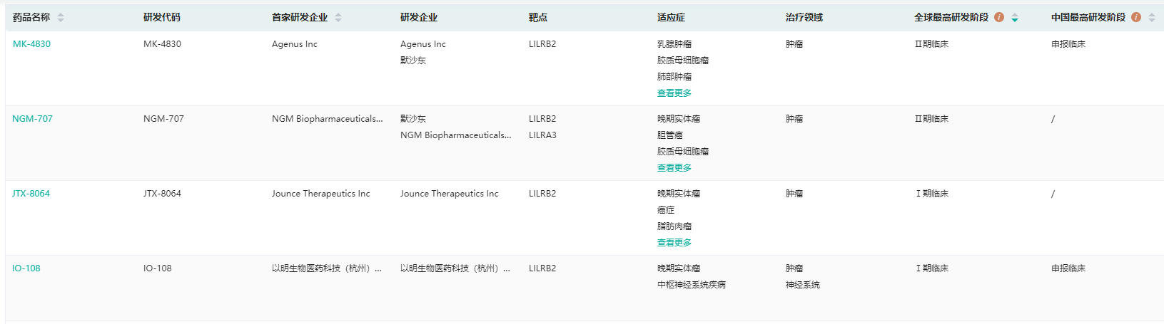 经药融云数据库查询,全球范围内在ILT4靶向药物领域投入研发的企业较少,其中,默沙东处于绝对领先地位,旗下2款均已进入2期临床,除了此次的MK-4830,还有一款双抗药物NGM-707。国内药企中,以明生物的IO-108研发进展最快。