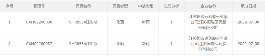 2022年7月8日,药审中心承办了江苏恒瑞医药股份有限公司的1类化药新药,药名SHR8554注射液的上市申请。