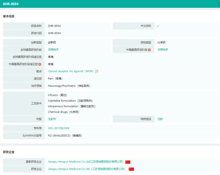 经药融云数据库查询,SHR8554注射液是恒瑞医药自主研发的靶向μ阿片受体(MOR)的小分子药物,用于治疗手术后疼痛。