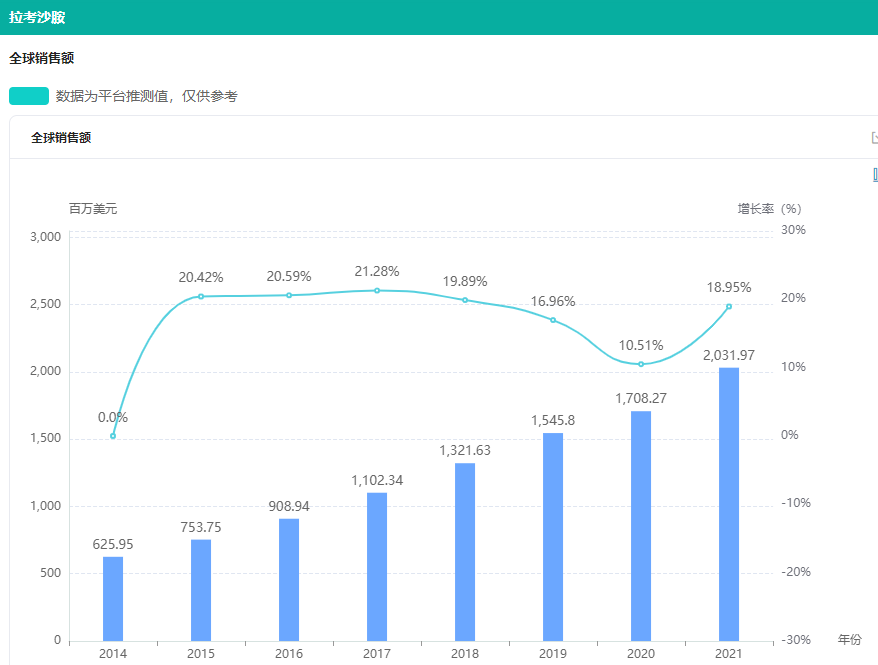 拉考沙胺(lacosamide),也叫拉考酰胺,原研来自比利时优时比子公司施瓦茨法姆制药公司 ( Schwarz Pharma),最早于 2008 年 9 月率先在欧盟获批上市,商品名为 Vimpat,是具有双重机制作用的抗惊厥药物,用于治疗癫痫和神经性疼痛。据药融云统计,拉考沙胺2021年全球销售额超20亿美元,已久保持稳定增长。