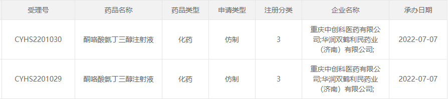 2019年5月,成都倍特拿下酮咯酸氨丁三醇注射液首家过评,后四川美大康佳乐药业、山东新时代药业、永信药品和南京海融制药陆续过评。除了此次申报的重庆中创科医药/华润双鹤利民药业外,云南龙海天然植物药业和永信药品工业也分别递交了酮咯酸氨丁三醇注射液的3类化药上市申请和一致性评价补充申请。