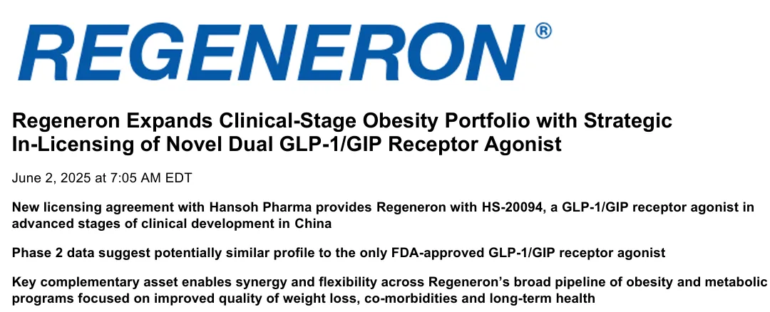 2025年6月2日,再生元(Regeneron)宣布与中国生物制药公司翰森制药(Hansoh Pharmaceuticals Group)达成一项重磅合作,以近20亿美元的总投入获取 GLP-1/GIP 受体激动剂 HS-20094 的开发、生产及商业化的全球独占许可权益(不含中国内地、香港及澳门)。