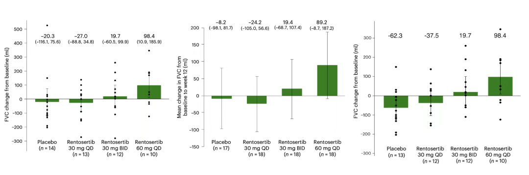 (右图)治疗12周后FVC变化值及其95%置信区间,分析中排除了两个患者数据:一个为安慰剂组的患者,另一个为Rentosertib 30 mg QD组的患者。这两名患者筛查与基线肺活量测量值之间的差异超过600 mL,导致其基线FVC值存在不确定性。