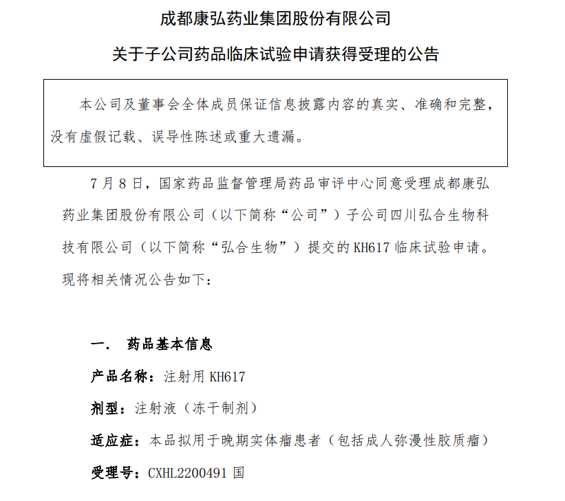 2022年7月11日,药审中心承办了成都康弘药业集团股份有限公司(以下简称“康弘药业”)子公司四川弘合生物科技有限公司(以下简称“弘合生物”)提交的1类新药KH617的临床试验申请。