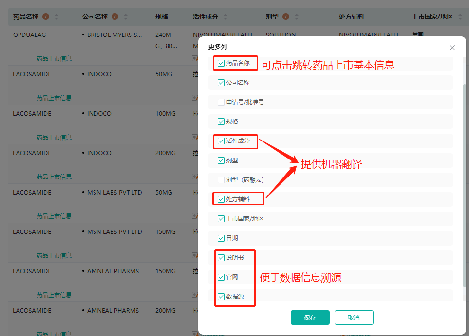 包含药物上市基本信息,规格、厂家、上市时间、剂型等。提供药品活性成分、辅料组成查询。同时也提供说明书和数据来源,便于数据信息溯源,为广大研发、调研人员节省信息检索时间和减少检索障碍。同时也为辅料调研提供数据支持。
