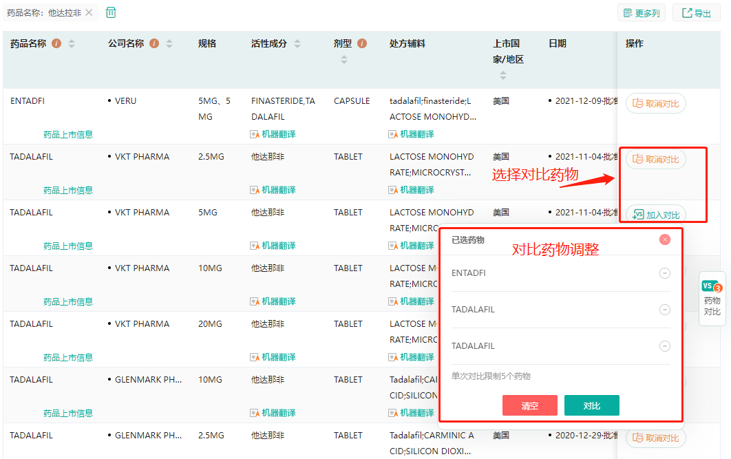 单次可对比最多5个药物