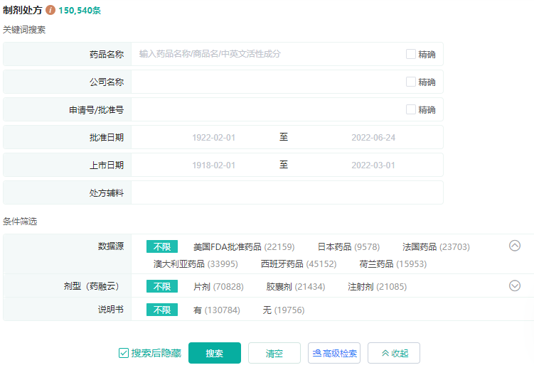 收录了美国、日本、澳大利亚、欧盟等国家的药品制剂处方数据,其他国家的数据正在陆续补充中。可通过药品名称、活性成分、公司、批准号、剂型等快速检索原研处方信息。