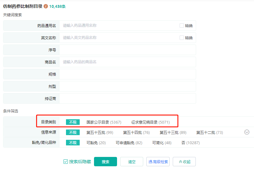 仿制药参比制剂目录,增加“目录类别”筛选项,用户可根据需求分别选择“正式目录”数据和“征求意见稿”数据进行查询。