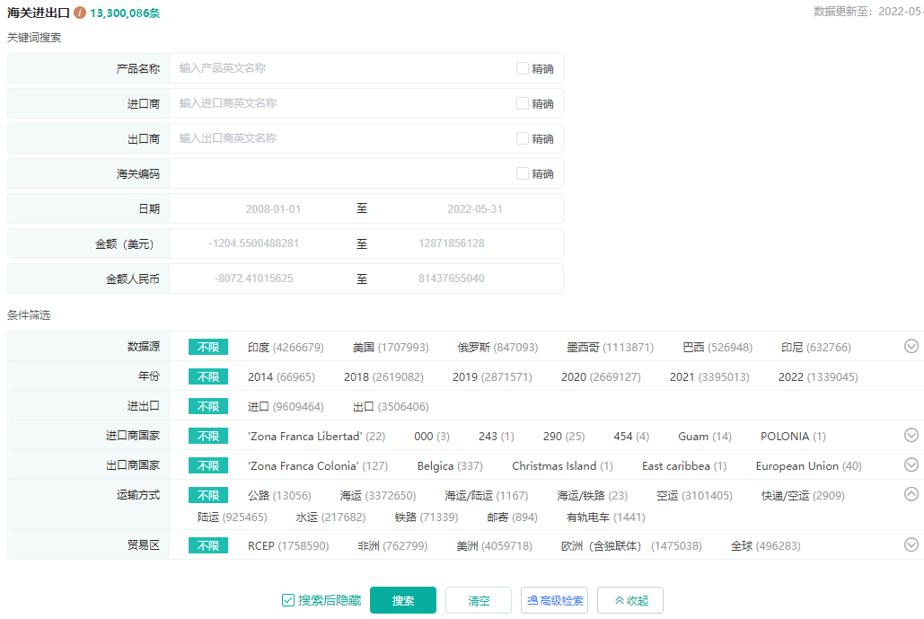 3、可通过贸易地区(对应大洲)、年份、售、购双方企业所在国家,运输方式等条件进行筛选查看(高级检索中,可同时检索多个条件)
