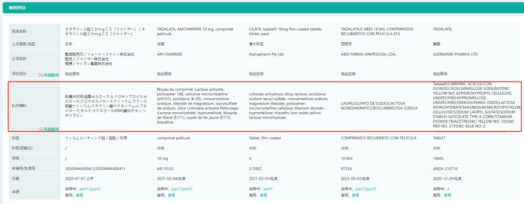 在搜索结果页面,可选择目标厂商药物,进行制剂处方对比,直观对比各个厂商、国家药品信息,制剂处方的组成。为药物研究提供参考。