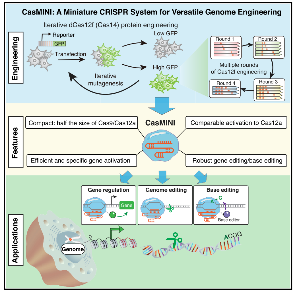 2021年10月,Stanley Qi团队在《Molecular Cell》上发表了题为Engineered miniature CRISPR-Cas system for mammalian genome regulation and editing 的研究论文。文中提到,通过引导RNA和蛋白质工程创建了CasMINI,该系统由V-F型Cas12f(Cas14)系统设计而成,其尺寸不到目前使用的CRISPR系统(Cas9或Cas12a)的一半,是迄今已知的最小 CRISPR 系统。CasMINI功能强大,可以驱动高水平的基因激活(高达数千倍的增加),而天然的Cas12f系统无法在哺乳动物细胞中发挥作用。CasMINI系统在基因激活方面具有与Cas12a相当的活性,具有高度特异性,并允许强大的碱基编辑和基因编辑,因体积较小,可以通过AAV或LNP等各种递送载体更高效地递送细胞内。