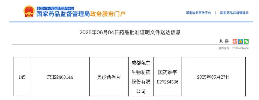近日(6月4日),国家药监局(NMPA)官网显示,成都苑东生物制药股份有限公司申报的奥沙西泮片获批上市,视同过评。(受理号:CYHS2400144)。