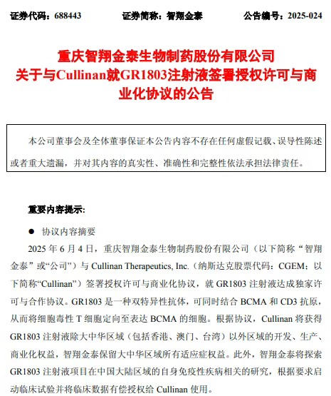 6月5日,智翔金泰发布公告:公司与 Cullinan Therapeutics公司(以下简称“Cullinan”)签署授权许可与商业化协议,就 GR1803 注射液达成独家许可与合作协议,交易总金额达7.12亿美元(约51.14亿人民币)。