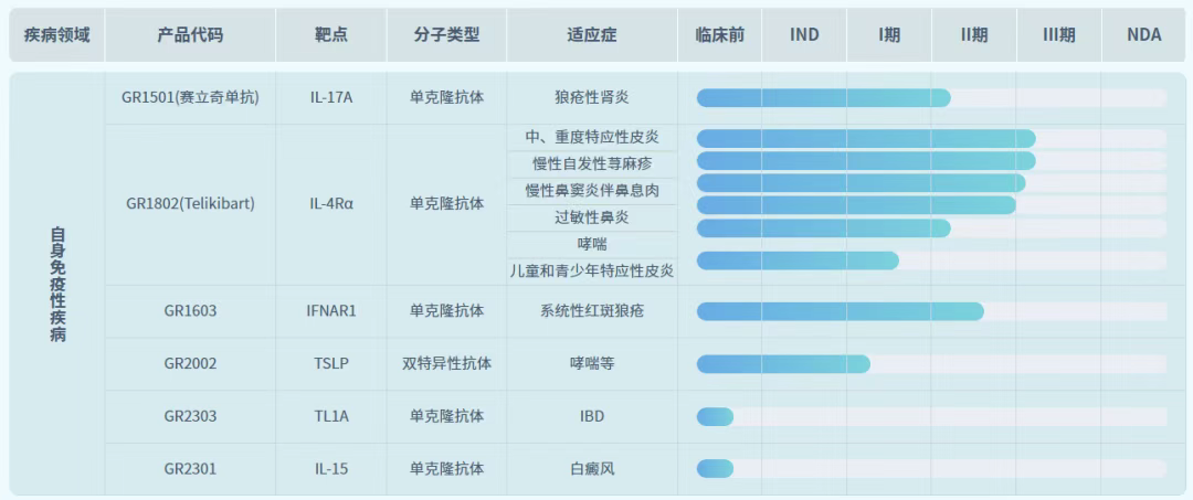 公司聚焦自身免疫性疾病、感染性疾病和肿瘤三大领域,持续开发单克隆抗体和双特异性抗体药物。其中,赛立奇单抗注射液(商品名:金立希 ®)是银屑病治疗市场首个国产全人源抗 IL - 17A 靶点的单抗药物,已覆盖中重度银屑病和强直性脊柱炎。GR1802(IL - 4Rα)对标全球 “药王” 度普利尤单抗,覆盖特应性皮炎、慢性鼻窦炎伴鼻息肉等大适应症,III 期临床推进中。GR1803(BCMA×CD3 双抗)针对复发 / 难治多发性骨髓瘤,采用非对称亲和力设计,ORR 达 85%,高于辉瑞和强生的竞品。此外,GR1801(狂犬病双抗)是全球首款被动免疫疗法。