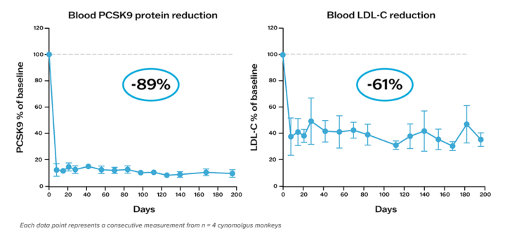 而在注射六个月后,PCSK9 蛋白和 LDL-C 的降低仍维持在此水平。