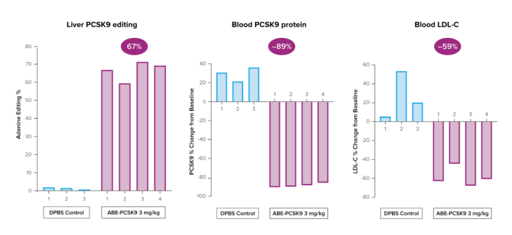 在临床前验证研究中,单次静脉输注VERVE-101实现了 67% 的全肝细胞 DNA 编辑,血液中 PCSK9 蛋白水平降低了 89%,血液中LDL-C降低了 59%,并且未见脱靶效应。