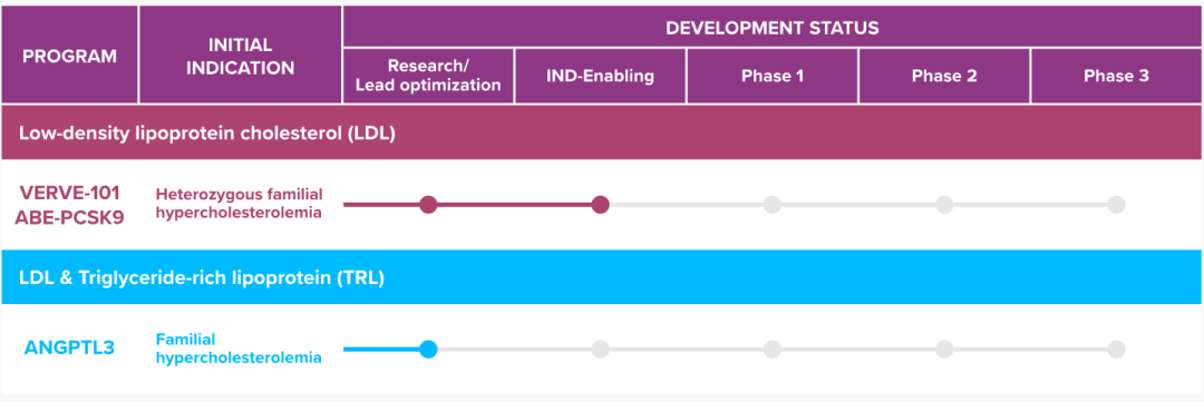 Verve认为:按照目前的HeFH治疗方案,只有不到20% 的患者达到LDL-C目标水平。而Verve公司目前的目标是专注于心血管疾病的碱基编辑疗法,除了靶向PCSK9的VERVE-101,其同时还在研发靶向ANGPTL3的新药物,用于具有两个突变等位基因的HoFH患者或具有HeFH的患者。