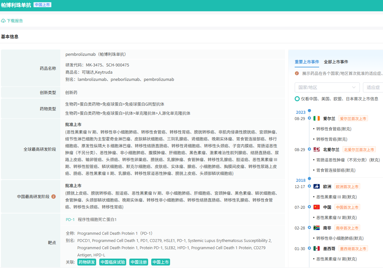 2018年,帕博利珠单抗获批在中国上市,在国内获批适应症覆盖黑色素瘤、非小细胞肺癌、食管癌、头颈部鳞状细胞癌、以及结直肠癌等。
