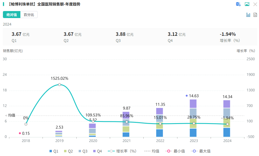 其院内销售表现力亦不容小觑,目前在全国院内市场的销售总额超58亿元,2024年达14.34亿元。