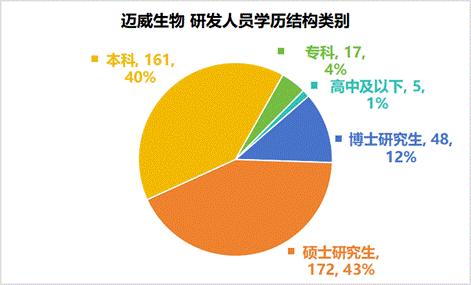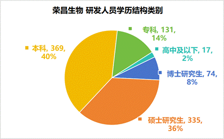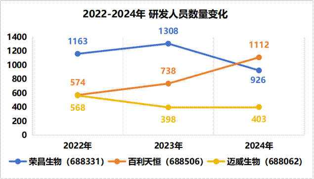 荣昌生物近三年中2023年的研发人员数量达1300多人,2024年度公司对研发管线和研发人员进行调整和优化,控制研发投入并优化管理人员结构以提升运营和管理效率。研发人员布局硕士研究生以上学历占比44%,本科学历占比40%。