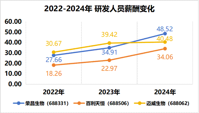 其中以荣昌生物2024年48.52万元的研发人员平均薪酬居于首位。同比2023年增幅达39%,其三年累计增幅达75.4%。