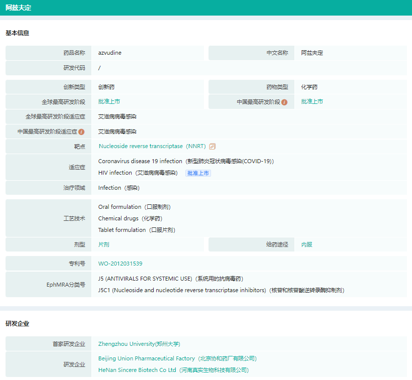 阿兹夫定是一种抑制病毒RNA依赖性RNA聚合酶(RdRp)的核苷类似物,能特异性作用于新冠病毒RdRp,从而抑制病毒复制。据药融云数据库显示,阿兹夫定早在2021年7月就被批准上市,用于与核苷逆转录酶抑制剂及非核苷逆转录酶抑制剂联用,治疗高病毒载量的成年HIV-1感染患者,成为我国首款真正拥有自主知识产权的抗艾滋病病毒药物。2020年2月,阿兹夫定被发现可以抗新冠病毒;同年4月被SFDA批准抗新冠三期临床试验。