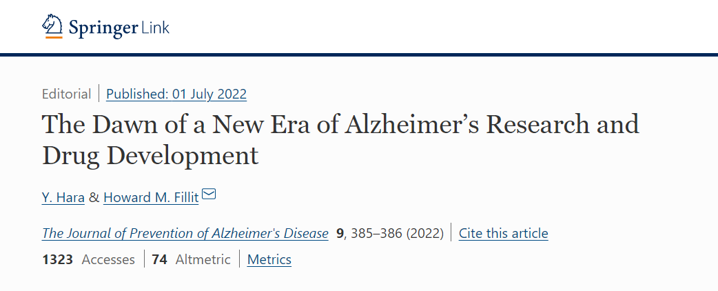 [1] Hara, Y., Fillit, H.M. The Dawn of a New Era of Alzheimer’s Research and Drug Development. J Prev Alzheimers Dis 9, 385–386 (2022). https://doi.org/10.14283/jpad.2022.64