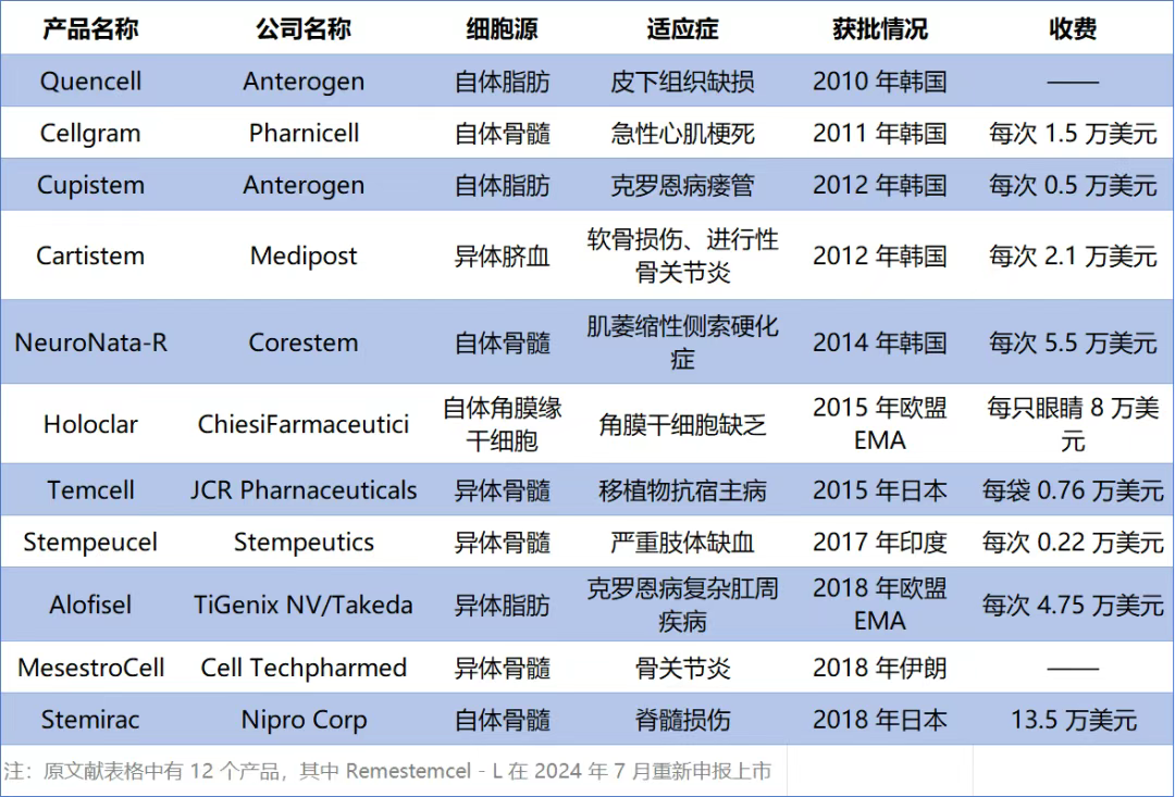 除了睿铂生,目前全球还有10多款干细胞药物上市,如下所示: