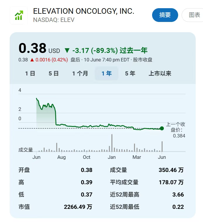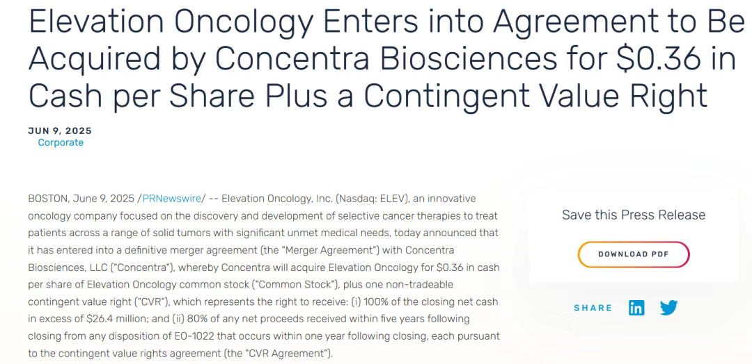 外加一项不可交易的或有价值权(CVR),该CVR使股东有权在特定时间内,基于Elevation Oncology唯一候选药物EO-1022产品交易收益的 80%,以及超过 2640 万美元基准线的剩余现金。