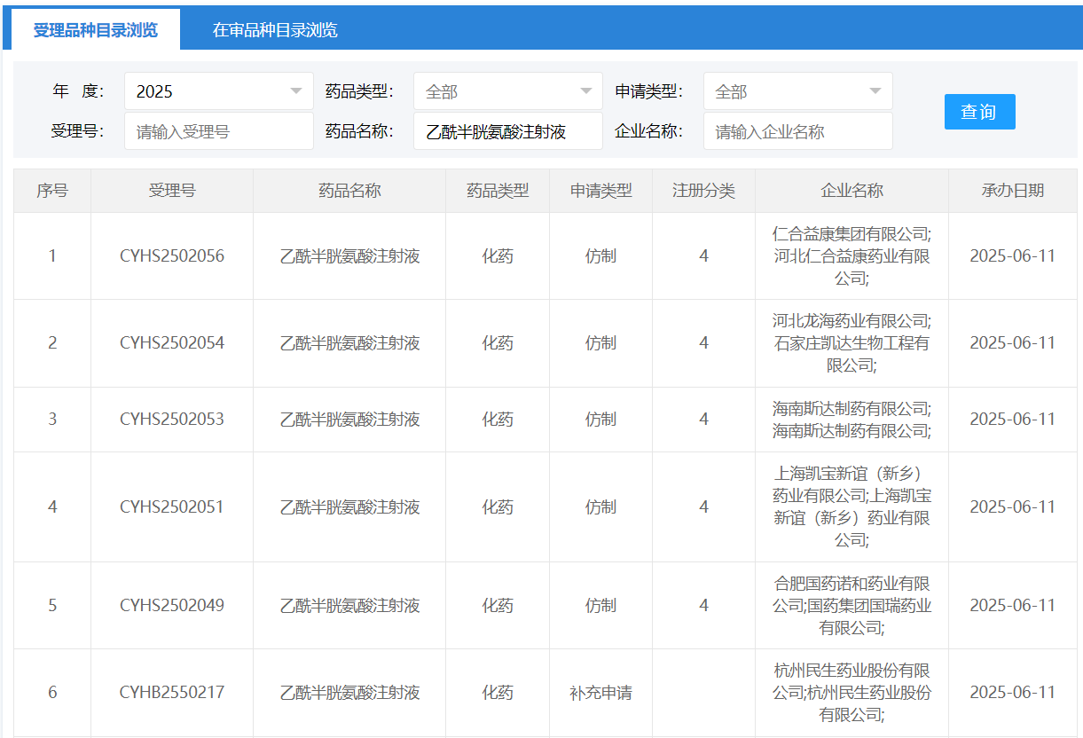 自2025年5月21日赞邦原研的乙酰半胱氨酸注射液正式获批至今,仅20天时间,该品种申请上市的企业已达19家。