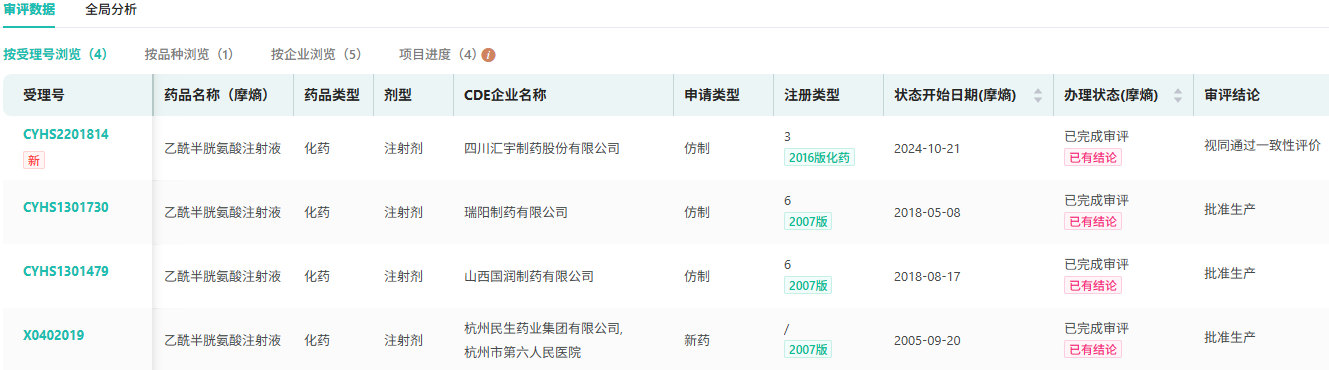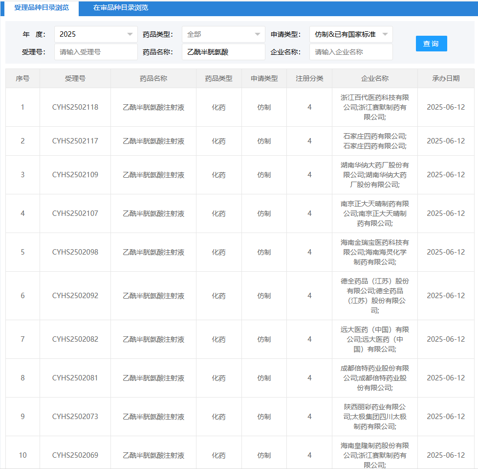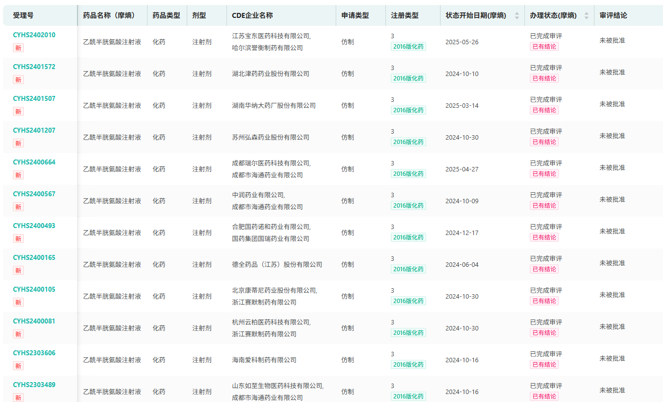 仅一日,便有10家企业以4类仿制化药提交了乙酰半胱氨酸注射液的上市申请,均获受理,其中包含石家庄四药、正大天晴、远大医药、倍特药业等众多知名药企。