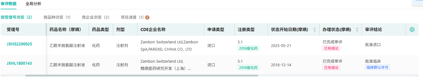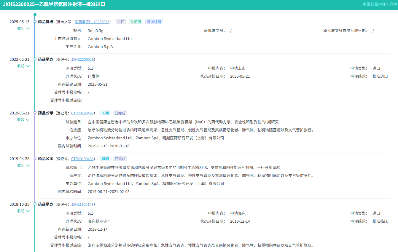 赞邦于2018年申请临床,并在中国完成I期和III期临床,历时七年,2025年5月21日,乙酰半胱氨酸注射液原研在国内获批上市。