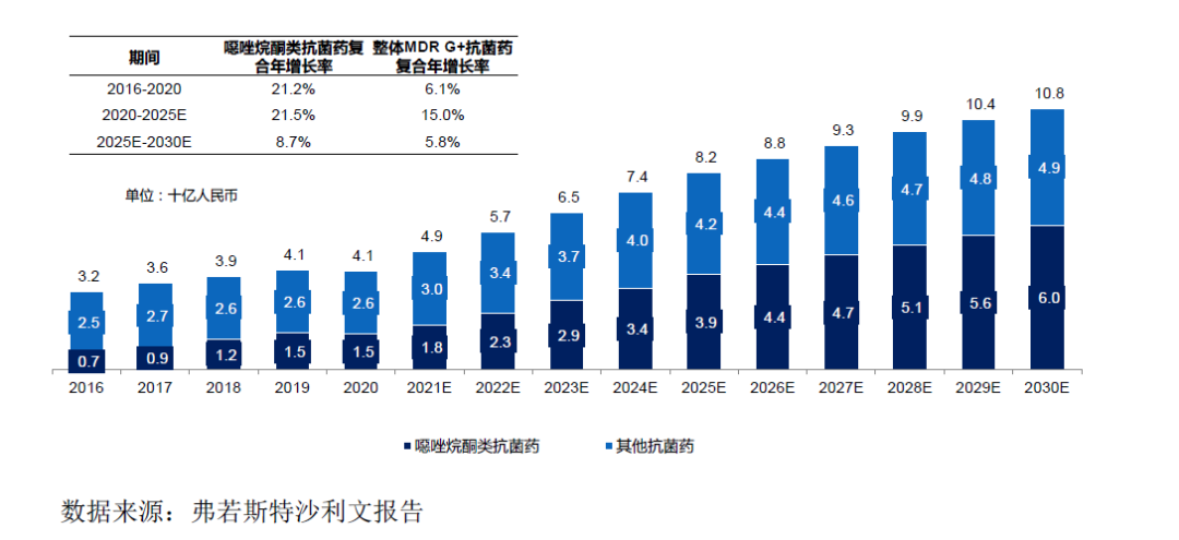 据弗若斯特沙利文数据显示,在政府遏制细菌耐药推进抗菌药分级管理等有利政策推动下,中国治疗多重耐药革兰阳性菌感染的抗菌药市场规模将在2030 年达到108 亿元。其中,噁唑烷酮类药物在中国治疗多重耐药革兰阳性菌感染的抗菌药市场中持续呈增长,预计将在2030 年增长至60 亿元。
