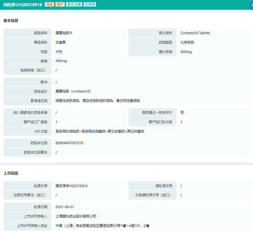 而在获批上市的当年,康替唑胺即被纳入2021年国家医保目录(乙类),适用于治疗由对本品敏感的金黄色葡萄球菌(甲氧西林敏感和耐药的菌株)、化脓性链球菌或无乳链球菌引起的复杂性皮肤和软组织感染。这既表明了康替唑胺是百姓需要的药,同时也为产品的后续销售提供了保证。举个例子,从医保报销角度,康替唑胺可以是一线治疗用药;而其竞品利奈唑胺是二线,必须在万古霉素治疗无效之后才能用。