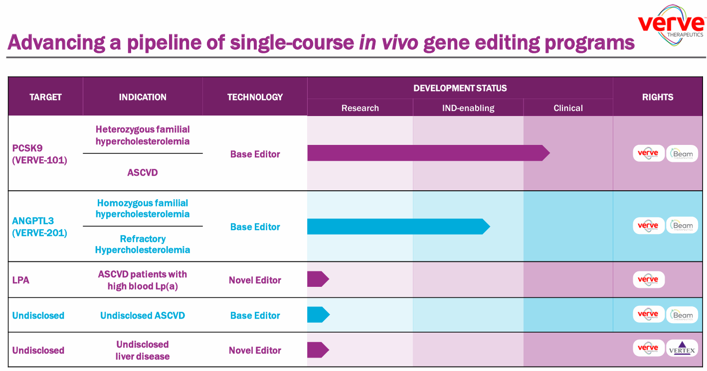 Verve研发管线今年4月,Verve Therapeutics 宣布其靶向PCSK9的基因编辑疗法VERVE-102的1b期临床试验初步数据令人鼓舞,显著降低LDL-C水平以及安全性良好。Verve计划于 2025年下半年完成 VERVE-102 的2期临床试验首例患者给药,并与礼来公司共享VERVE-102选择权。届时,礼来和Verve将在美国联合商业化VERVE-102,而Verve拥有其他地区的所有产品权利。