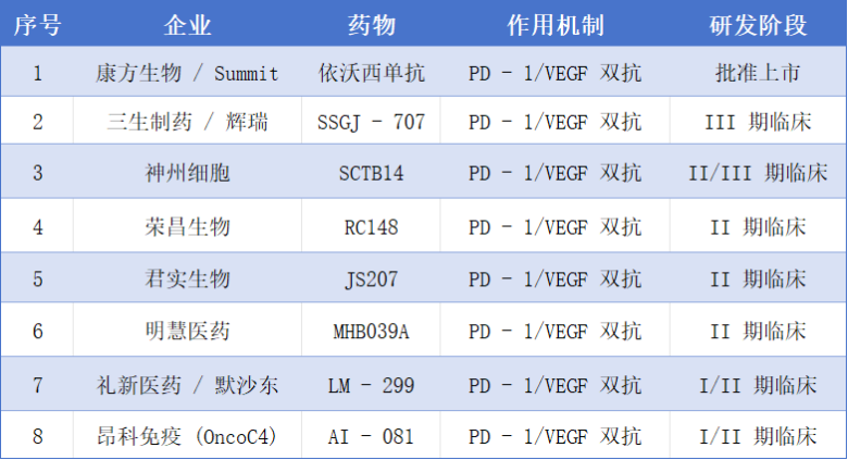 在肿瘤治疗领域,PD - 1/VEGF 双抗凭借独特作用机制,同时阻断 PD - 1 通路与 VEGF 通路,在肿瘤免疫逃逸和血管生成双重环节发力,成为研发热点。以下盘点了 PD - 1/VEGF 双抗药物8大辨识度较高公司。