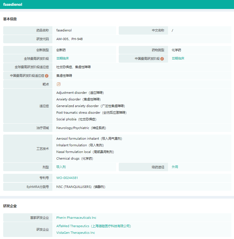 据药融云数据库显示,PH94B是用于焦虑、抑郁和其他中枢神经系统疾病的鼻喷雾剂候选药物。截至目前,针对社交恐惧症和焦虑性障碍适应症的临床实验已推进到临床3期。其他适应症还有创伤后应激障碍、适应障碍以及广泛性焦虑障碍。