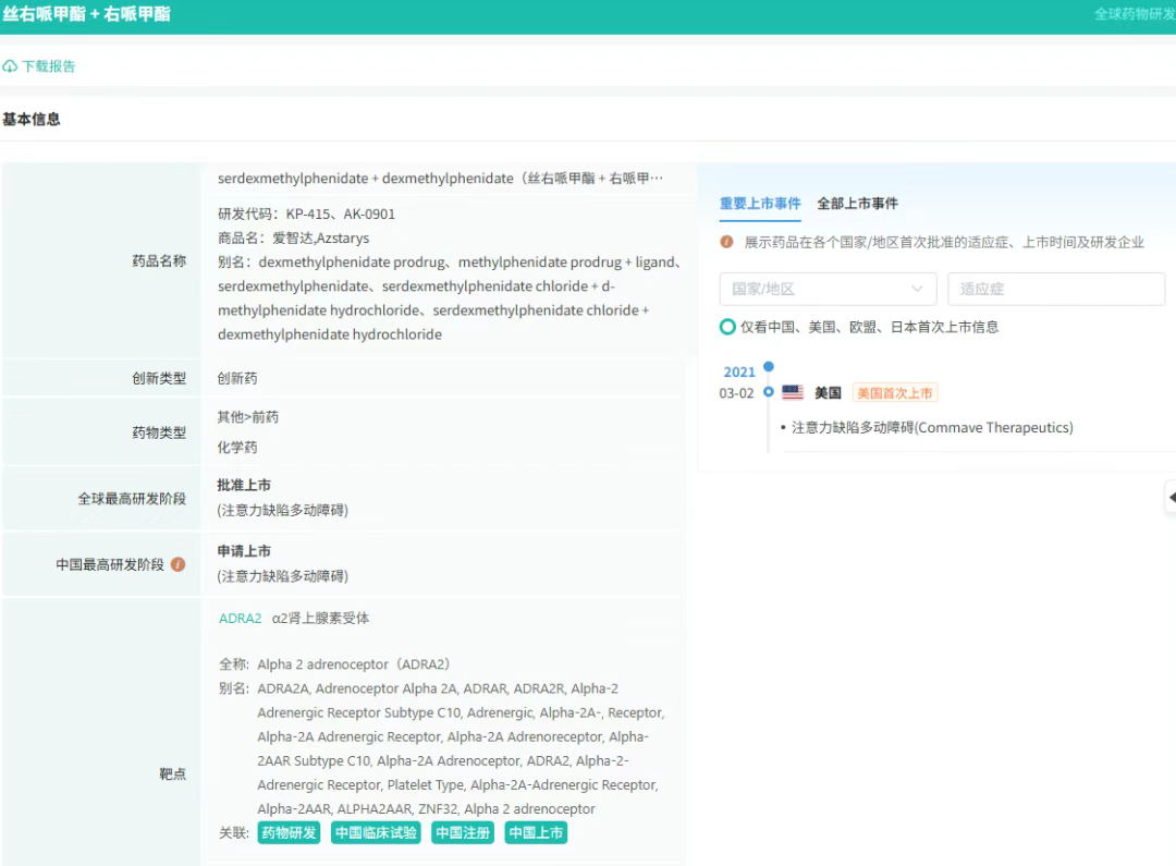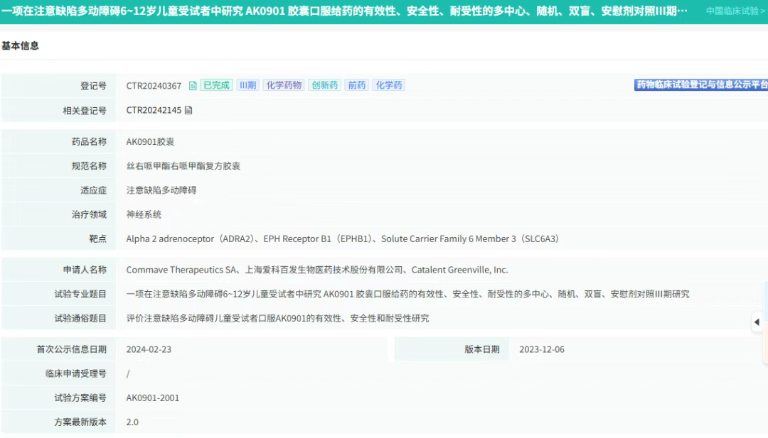 AK0901作为针对ADHD患者的Best-in-Class创新治疗药物,是一款含有速释右哌甲酯(d-MPH)和前药丝右哌甲酯(SDX)的复方制剂,2021年3月在美国获批上市,是FDA近20年来首款批准的新一代哌甲酯类药物。