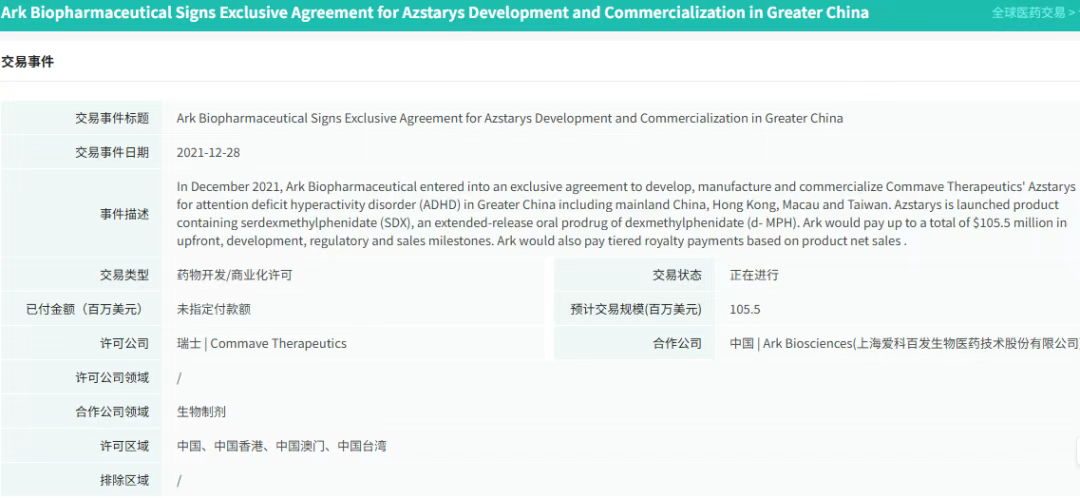 据摩熵医药数据库显示,2021年12月,爱科百发与Commave Therapeutics达成一项总金额为1.06亿美元的授权合作,获得了AK0901在大中华区的独家开发、生产及商业化权利。