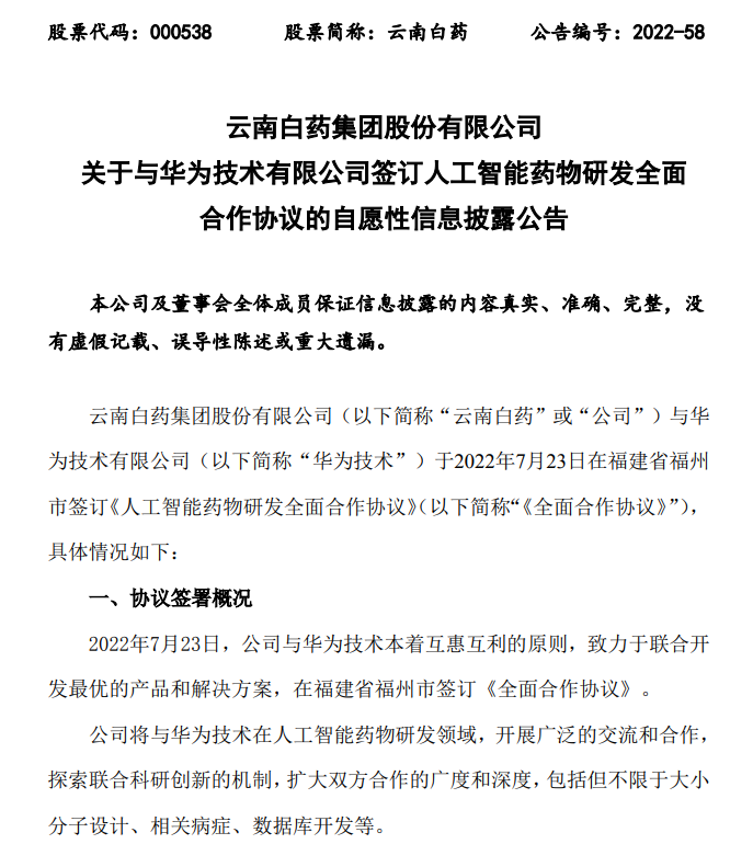 近期,云南白药发布公告, 云南白药集团股份有限公司与华为技术有限公司于2022年7月23日在福建省福州市签订《人工智能药物研发全面合作协议》。公司将与华为技术在人工智能药物研发领域,开展广泛的交流和合作,探索联合科研创新的机制,扩大双方合作的广度和深度,包括但不限于大小分子设计、相关病症、数据库开发等。