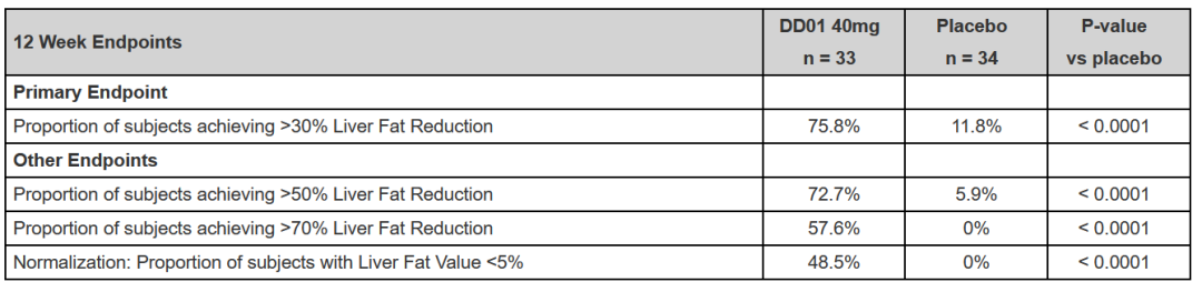 DD01-DN-02试验采用每周一次给药方案,以20 mg为起始剂量持续两周,随后进入40 mg维持剂量阶段。在第12周的预计疗效与安全性评估中,研究达到了主要终点,75.8%的受试者肝脏脂肪下降≥30%,而安慰剂组仅为11.8%。研究也达到了其他次要终点:72.7%的受试者肝脏脂肪下降≥50%,57.6%下降≥70%(均p<0.0001);平均肝脏脂肪含量下降62.3%,而安慰剂组仅为8.3%。此外,48.5%的DD01组患者实现肝脏脂肪含量正常化(经磁共振成像-质子密度脂肪分数[MRI-PDFF]测定≤5%),而安慰剂组无患者实现此标准。