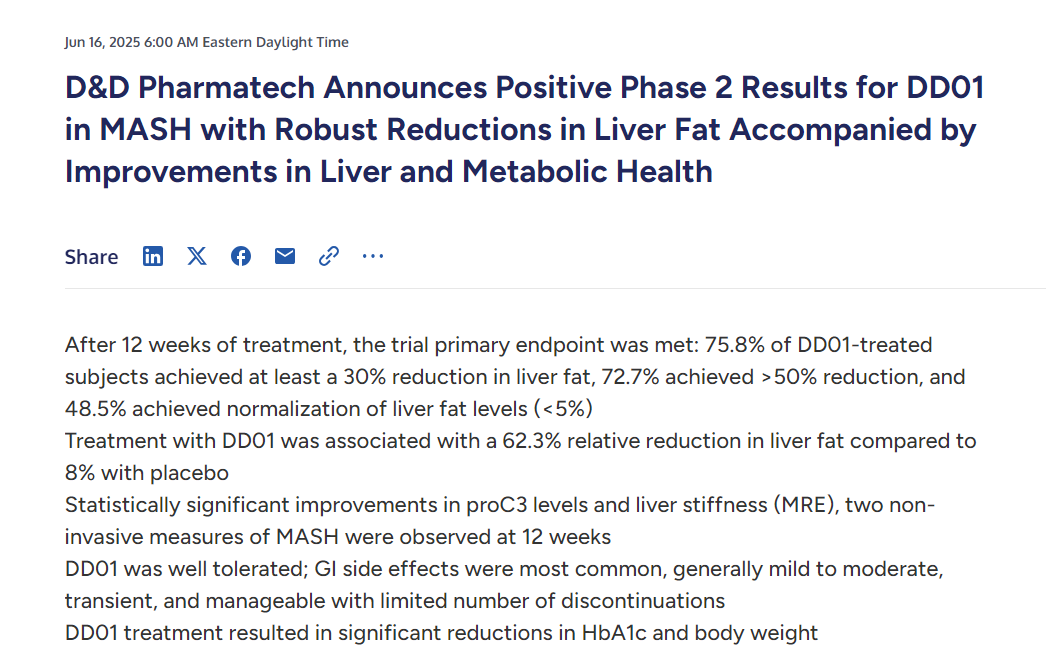 2025年6月16日,D&D Pharmatech,一家致力于开发突破性肝脏和代谢疾病疗法的临床阶段生物技术公司,宣布了其旨在评估DD01(一款长效GLP-1R/GCGR双重激动剂)在超重/肥胖的代谢功能障碍相关脂肪性肝炎(MASH)患者中的疗效与安全性的II 期DD01-DN-02研究达到了主要终点。