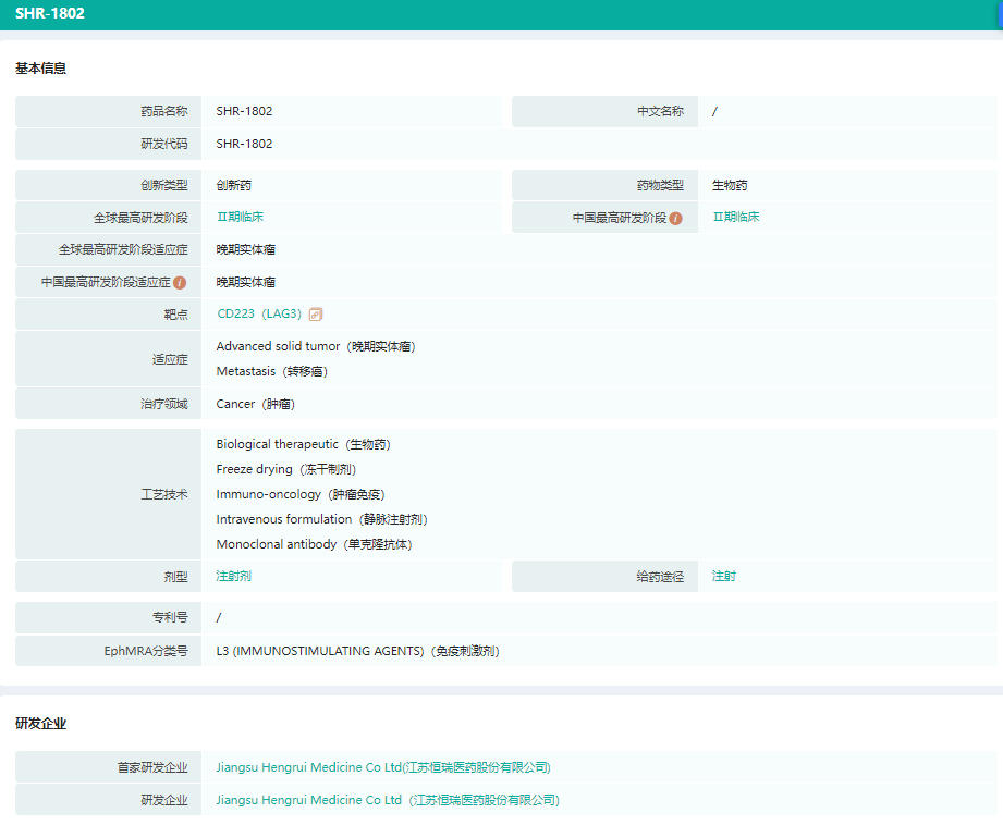 注射用SHR-1802为恒瑞医药自主研发和生产的人源化单克隆抗体,可激活和促进抗肿瘤T细胞应答,发挥抗肿瘤作用。经查询,目前国内暂无同产品上市,亦无相关销售数据。截至目前,注射用SHR-1802相关项目累计已投入研发费用约为3,035万元人民币。