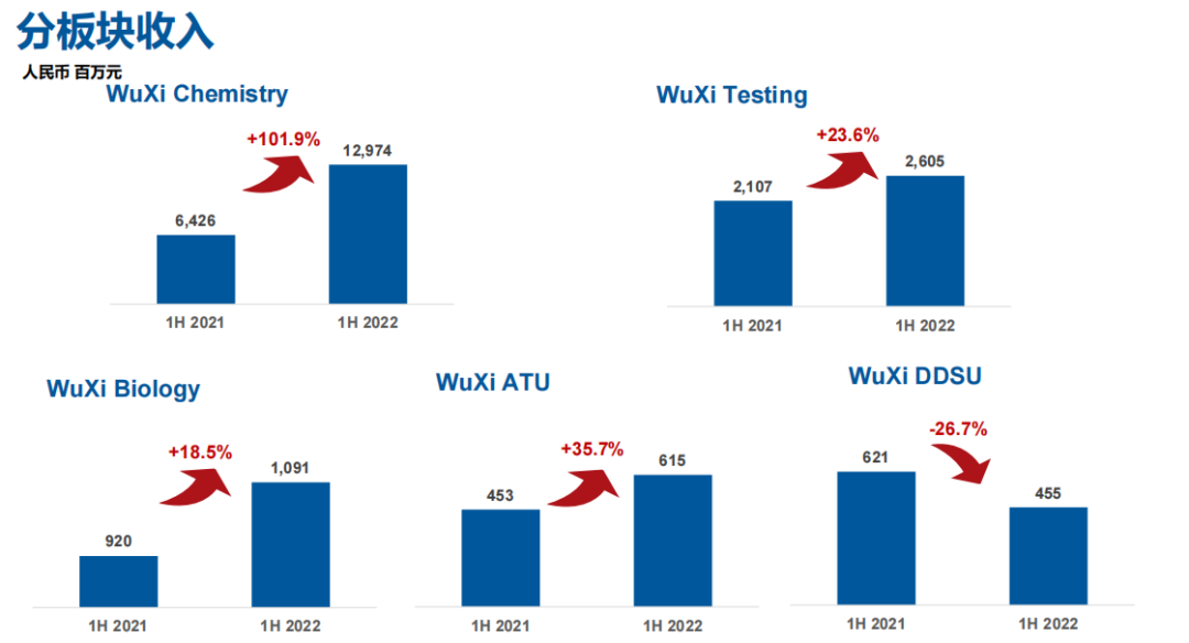 (1)化学业务(WuXi Chemistry)实现收入人民币 1,297,412.23 万元,较 2021 年同期实现收入人民币 642,578.53 万元,同比增长 101.91%。