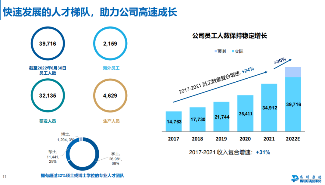 截止到今年上半年,药明康德共拥有 39,716 名员工,其中 11,441 名获得硕士或以上学位,1,294 名获得博士或同等学位。