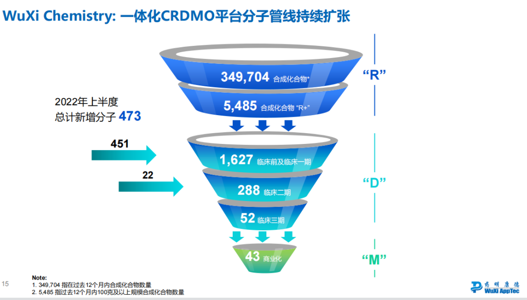 药明康德一体化CRDMO平台分子管线持续扩张,2022年上半度总计新增分子 473。