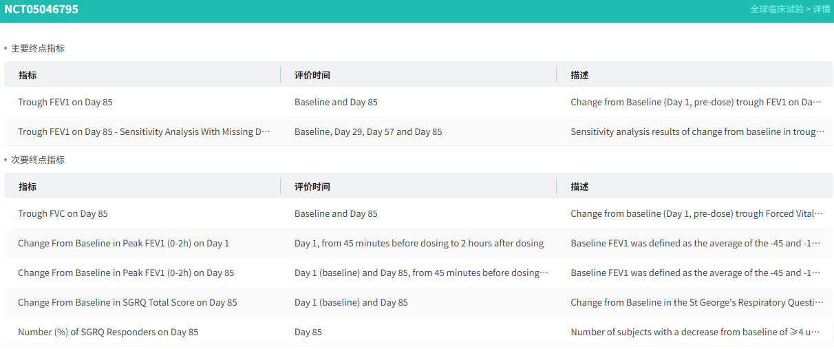 其获批上市是基于中国治疗COPD3期临床试验的积极结果。结果显示,瑞维那新组患者在第12周时,其24小时后的谷值第一秒用力呼气容积(FEV1)相较于基线水平的改善程度明显优于安慰剂组。