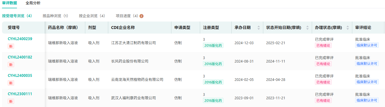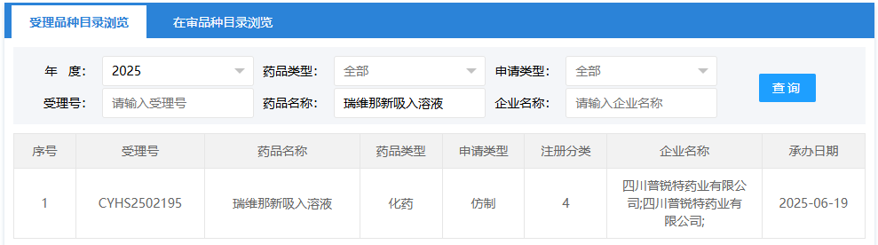 6月19日,据CDE官网显示,四川普锐特药业有限公司提交的4类仿制化药瑞维那新吸入溶液上市申请已获受理。